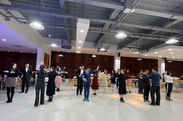 伴着歌声的余韵,成员们在国标舞协会陈利华和周勍同学的指导下步入舞池,开始学习交谊舞会的舞蹈礼仪。两位指导同学耐心地从步法、姿势、搭手动作等方面向在场成员们展示交谊舞的基本动作,成员们虚心学习并与舞伴不断尝试,伴随着华尔兹圆舞曲的优美旋律,展现出了名材班成员的优美舞步与自信风度。