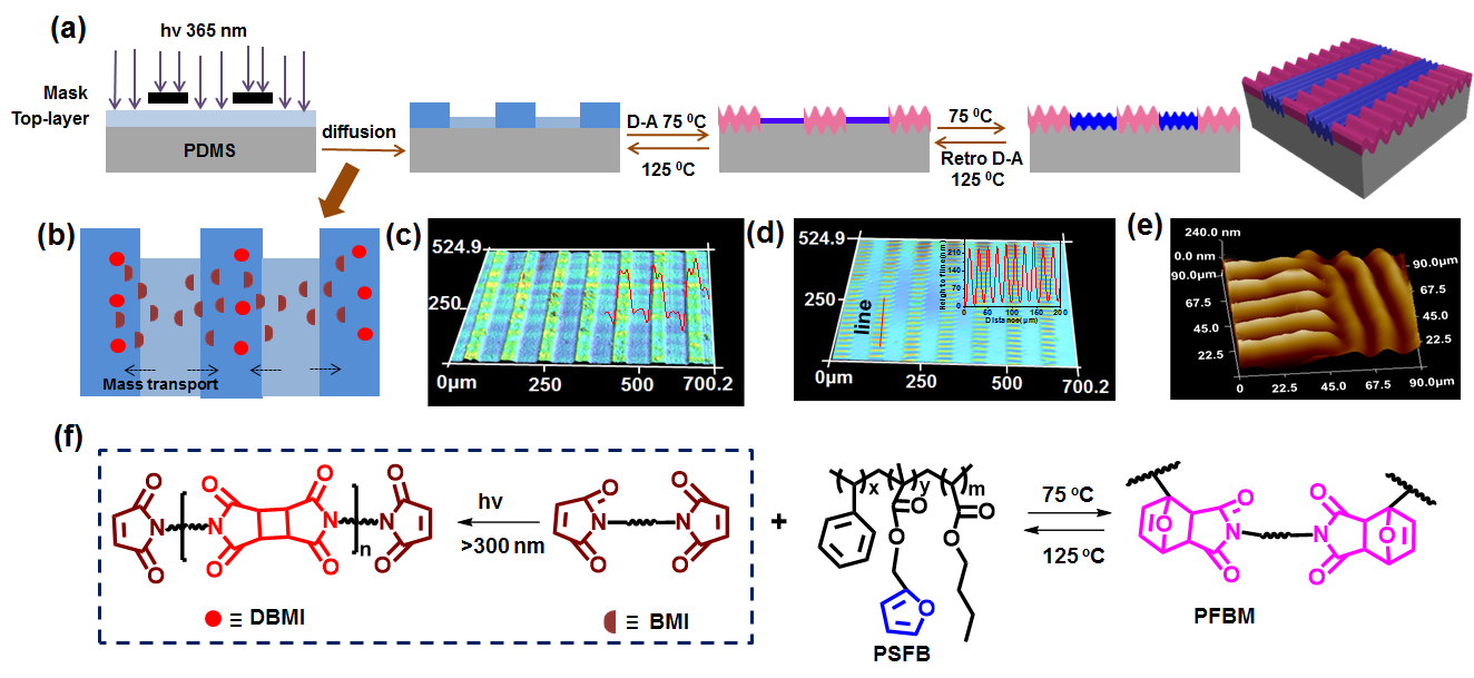 在基于对动态表面褶皱图案的研究基础上,以可逆交联聚合物网络和弹性体聚二甲基硅氧烷PDMS构建硬膜软基体系,课题组提出了通过利用马来酰亚胺的光二聚空间调控D-A反应的策略,制备出动态的3D正交取向褶皱图案。马来酰亚胺的光二聚不仅能够实现空间调控D-A反应,同时导致了反应诱导表面扩散形成光栅图案,进一步通过温度控制可逆D-A反应来调控表层的模量,从而使表面褶皱图案具有取向、3D、可程序化动态调控等特征。为了深入研究正交取向褶皱的形成机制,课题组与上海交大机动学院张文明教授团队合作,利用有限元分析的方法对薄膜进行了应力变化的理论计算与模拟,揭示了表面模量的二维分布和应力释放的方向是实现有序取向褶皱的关键。该方法得到的动态3D正交取向褶皱图案不仅加深对表面褶皱形成的认识,还为制备表面动态微纳结构提供了新途径,在可控表面粘附、浸润性和光学等方面具有一定的应用前景。