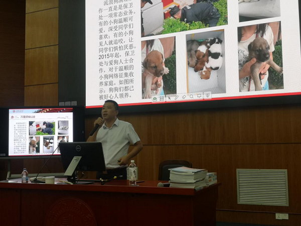 随后,杨立志老师为同学们上一堂校园安全教育课。杨老师首先向同学们承诺 “有事请拨打“54749110”,保卫处将秉持全心全意为同学服务的宗旨,保障同学们在学校的全方位安全。杨老师通过具体案例提醒新生要提高警惕,防盗防诈骗,时刻注意生命财产安全,通过校园事故视频让同学们认识到交通安全的重要,用身边同学的实际案例告诫新生谨慎交友,正确处理感情问题和心理困难,珍爱生命。杨老师诙谐幽默的安全教育既让新生提高了安全意识,也让大家感受到了交大保卫处的温暖体贴。