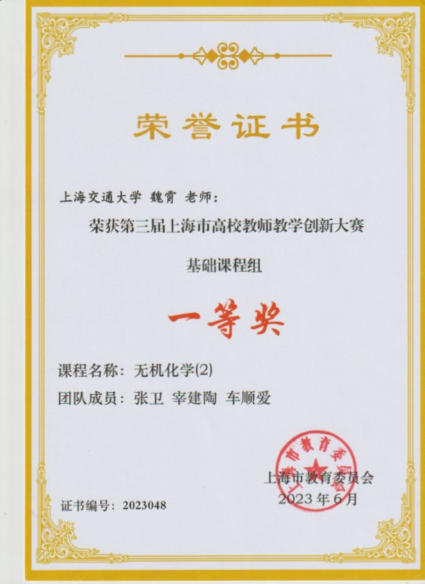 上海市重点课程《无机与分析化学》课程负责人,校重点课程《无机化学(2)》课程负责人,主讲本科生无机化学系列理论与实验课程。主持和参与国家级、省部级、校级教学改革研究项目十余项,发表教学论文近十篇。曾获得教育部化学“101计划”无机化学教学案例设计大赛一等奖、上海市高校教师教学创新大赛一等奖,校卓越教学奖、卓越(教学)副教授、教书育人奖、青教赛一等奖和教学能手等奖励,快猫 首批教学设计师。