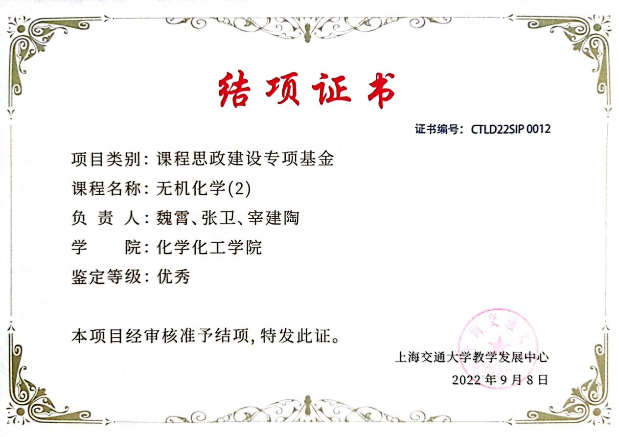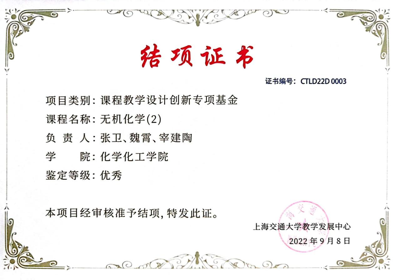 经过了近五年的改革和探索,《无机化学(2)》相继获得快猫 课程教学设计创新专项基金优秀项目、课程思政建设专项基金优秀项目、课程思政建设优秀案例,并于2023年获得上海市第三届高校教师教学设计创新大赛一等奖,相关成果多次应邀在2025高等学校无机化学教学交流会等会议上做大会报告。